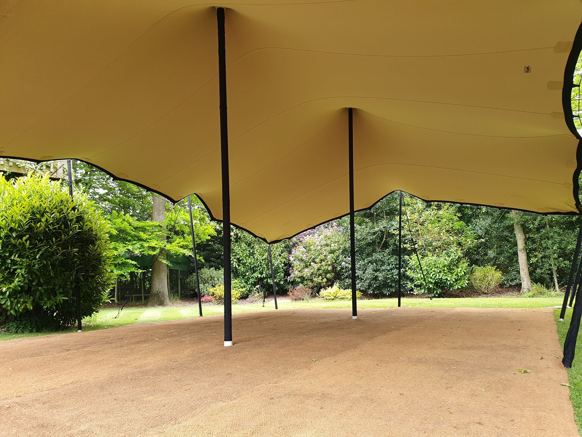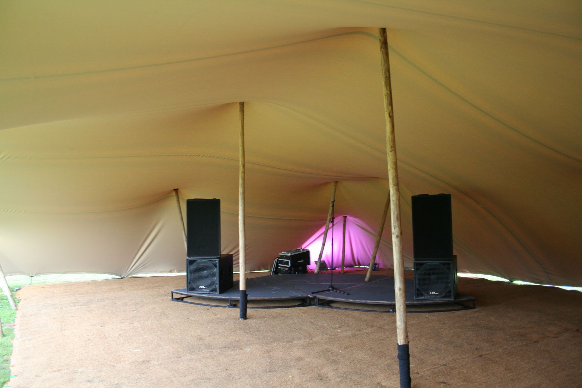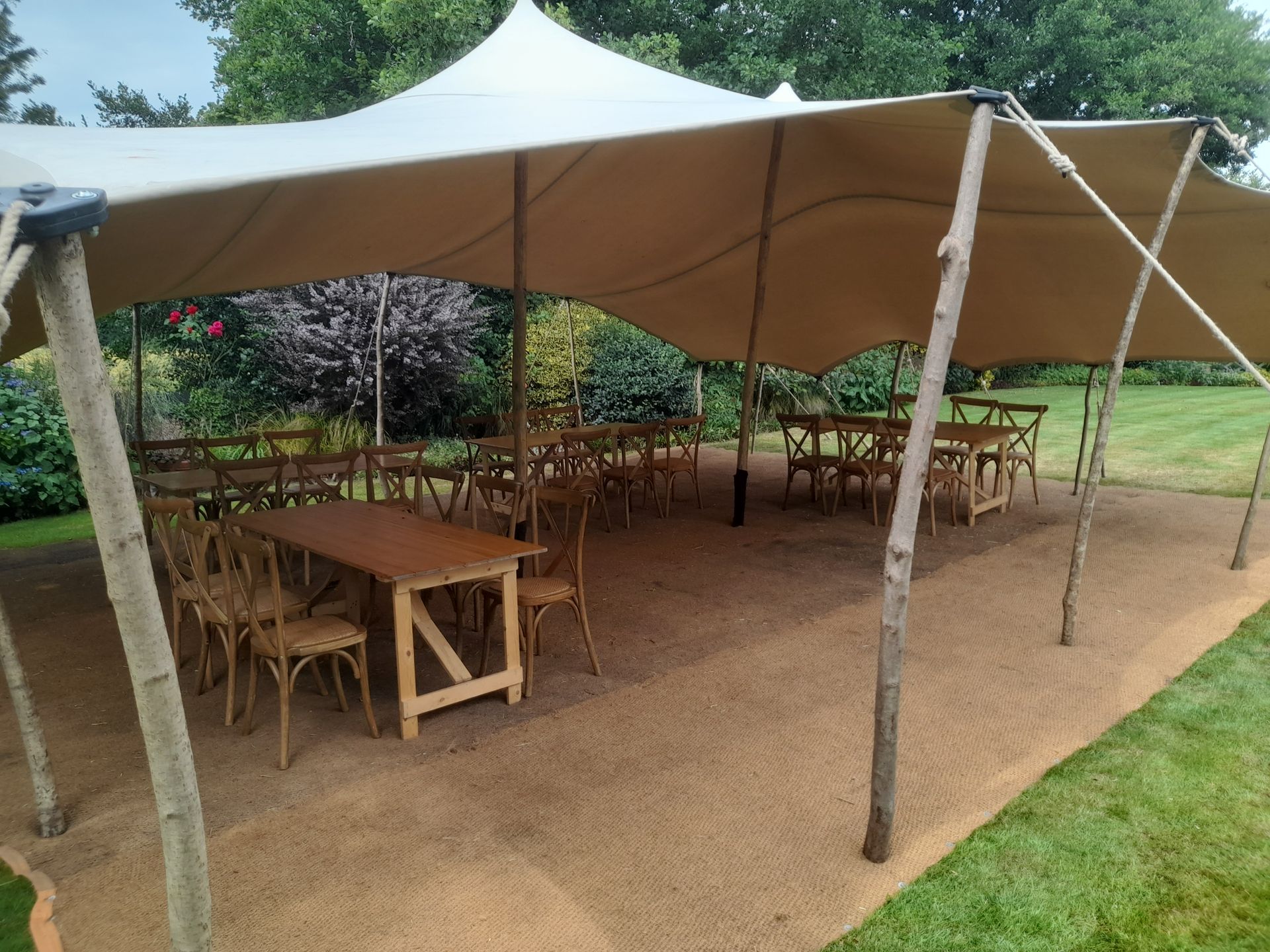 In Bonga brand stretch tents which have wooden poles every 2m around the tent we currently stock 15x20m, 10mx15m, 6.5x11.5m,7.5x8.5m, 7.5mx7.5m, 6.5x6.5m and 5x6.5m.